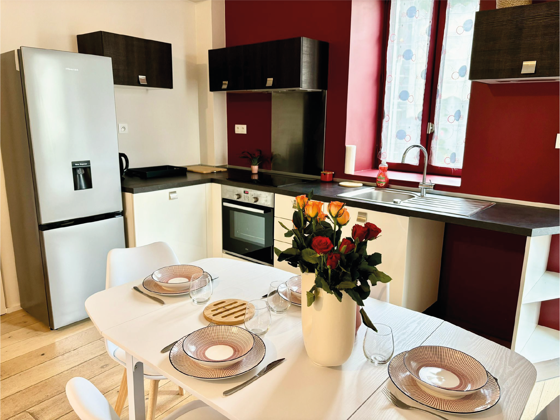 Vous profiterez d’un séjour lumineux qui s’ouvre sur une cuisine entièrement équipée avec four, plaque de cuisson, réfrigérateur, hotte, cafetière et tout le nécessaire pour préparer vos repas. Une table à manger pour 6 personnes et un salon confortable avec un canapé-lit et une télévision sont à votre disposition. De nombreux espaces de rangement facilitent votre séjour.